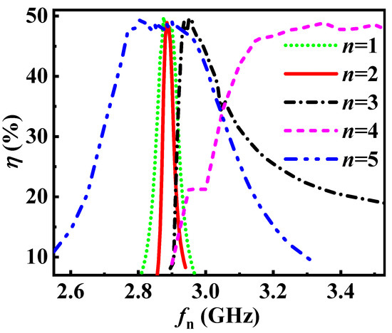 Efficiency versus frequency of the cavity (, , , , are frequency of the input cavity, cavity 2, cavity 3, cavity 4, and output cavity, respectively.).