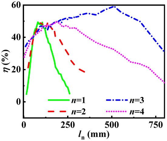 Efficiency versus drift tube length (, , and , are the drift tube length I, II, III, IV, respectively.).