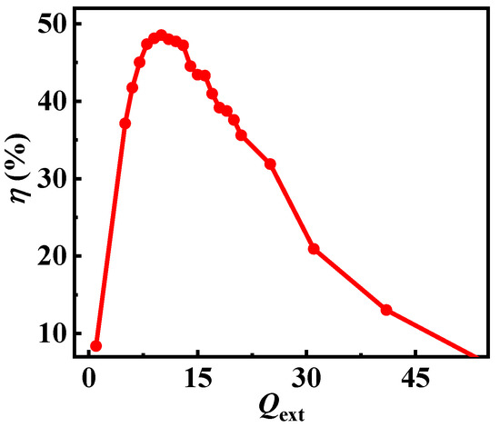 In the output cavity, the was used to describe its coupling with the external coupler waveguide, and relate closely to its gap voltage to decelerate the modulated electrons sufficiently. Generally, the gap voltage of the output cavity is roughly equivalent to the beam voltage when the electron beam is well-modulated. If the gap voltage is too high the partial beams will turn around, resulting in a decline in the efficiency. Therefore, it is necessary to find an appropriate of the output cavity to obtain a high efficiency. As shown in Figure 6, the best of the output cavity is 10, and its range is very limited.