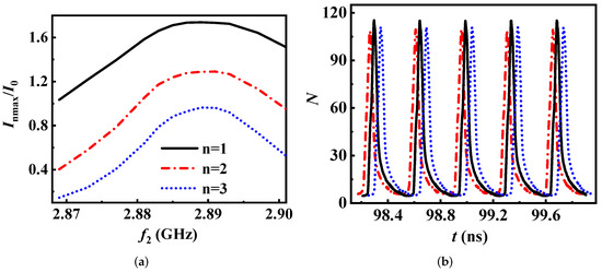 From Section 3.1, it is known that the frequency of the cavity 2 () should be near the operating frequency, and its range is very limited. In this section, we simulated the modulation current (, n = 1, 2, 3) and the number of particles (N) at the entrance of the output cavity in 3-D PIC. It should be noted that N is physical particles within each macroparticle in CHIPIC. Additionally, the analysis of (n = 1, 2, 3) and N is illustrated in Figure 7. In Figure 7a, the first harmonic maximum current modulation factor () is over 1.6 as increases from 2.885 to 2.893 GHz, and the changes in (n = 2, 3) coincide well with . This suggests that the beam-wave interaction efficiency is high within this range of . In Figure 7b, N is largest when is 2.889 GHz, proving that the peripheral electrons kicked into the bunching core is the most. Consequently, for the CMB-RKA, the frequency of the cavity 2 is 2.889 GHz and is 1.78 respectively.