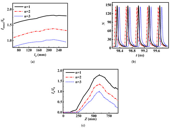 After the velocity modulation in the first of three cavities and the density modulation in the drift tube, the bunching core has been formed. To improve beam-wave interaction efficiency, the drift tube length III () should be long enough to collect the peripheral electrons. When is from 180 to 240 mm, is over 1.75, and the changes in (n = 2, 3) coincide well with (Figure 8a). In addition, N is largest when is 210 mm (Figure 8b). Therefore, the drift tube length III () is 210 mm and is 1.81, respectively. Figure 8c shows the distribution of the modulation current along the z-axis. When Z = 591 mm, (n = 1, 2, 3) is the largest. Hence, we can set the output cavity at Z = 591 mm to obtain the highest RF power.
