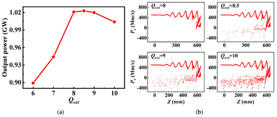 The of the output cavity is closely related to the extraction of output microwave energy, and there is an optimal value (Figure 9). As of the output cavity increases, the number of electrons that run back towards the negative z-axis increases, leading to a decrease in output power. Consequently, the of the output cavity is set as 8.