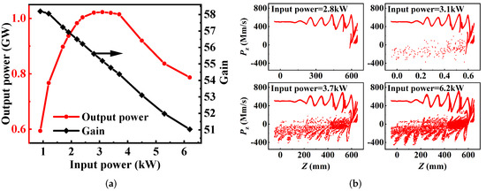 (a) Output power and gain versus input power. (b) Axial momentum of the electrons along the length of the CMB−RKA.