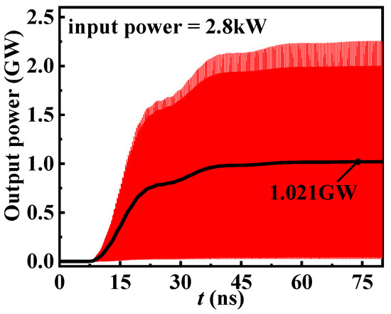 After optimization, the waveform of output power is shown in Figure 11. The output power and efficiency are 1.02 GW and 48.7%, respectively, indicating that the S-band CMB-RKA can operate stably with high efficiency.