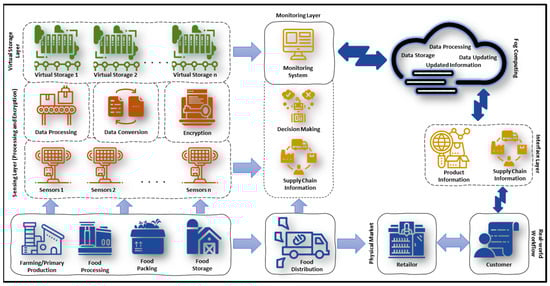 - Virtual storage layer: The encrypted data transmitted by the sensing layer are sent to the virtual storage devices, and a copy of the information is forwarded to the parallel layer for monitoring purposes. Furthermore, the sensing layer is connected to virtual storage and communication devices to exchange content between the below and above layers. A virtual storage layer can also be utilized for collecting food product data. The key responsibility of the virtual layer provides services to the top layer for decision-making in addition to providing the facility to monitor the supply chain during the production process;