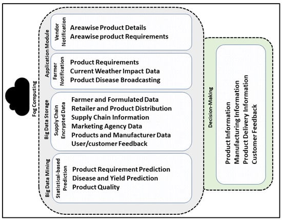 The FogAuth-FT food traceability system also utilizes fog computing to enhance efficiency and to improve the integrity for the quick identification of a modification attack along with other features. Most of the existing approaches have utilized fog computing to reduce the latency or communication cost by the proposed mechanism integrating several distinct components. The proposed mechanism integrates four modules, i.e., application, big data storage, big data mining, and decision-making modules as illustrated by Figure 2. The application module is further divided into two modules, i.e., vendor notification and farmer notification. This model was added to improve the working efficiency of both vendors and farmers by updating them with the areawise product detail and requirement followed by the notifications related to weather conditions and disease to the farmers. Furthermore, the next module of the fog is big data storage, where the gathered data are stored in encrypted form using the Twofish algorithm. Data in this module can be used by the decision-making module during the formulation of decisions related to any specific product. Data in this module consist of farmer-formulated data, distribution data related to the product and retailer, supply chain information, marketing agency data, product manufacturer data, and user/customer feedback. The next module (big data mining) performs a significant role in food traceability by using the product quality, requirement, and disease information to trace the poor-quality food.