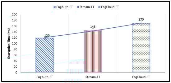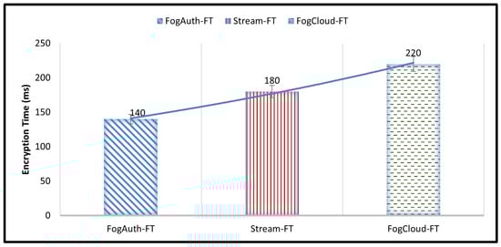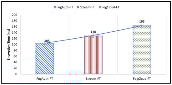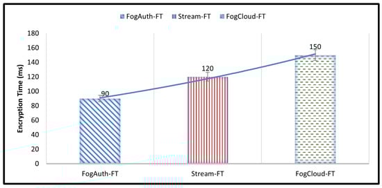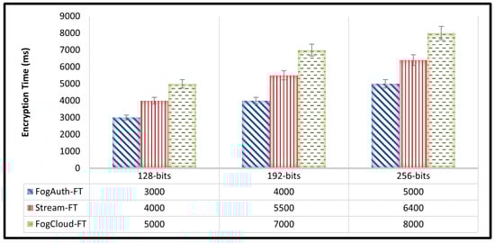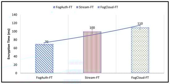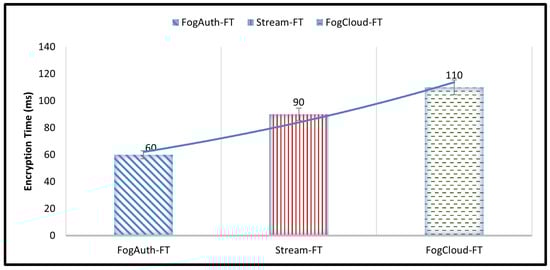 We implemented the Twofish algorithm in the proposed architecture and compared it with the existing approaches. In Figure 3, we take a key size of 128 bit and a block size of 192 bit for the three different techniques, i.e., proposed approach, Stream-FT, and FogCloud-FT. Therefore, we encrypted the same size and key plaintext with the three different techniques. FogAuth-FT performed the same task in less time as compared to others, where the encryption time was measured in milliseconds (ms). The proposed approach consumed 60 ms to encrypt the plaintext with a 128 bit key and a 192 bit block size.