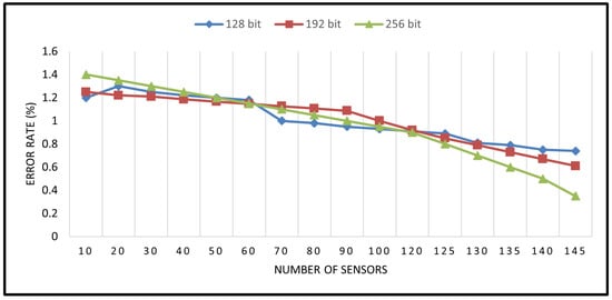 Encryption helps to maintain the integrity as data arrive from different resources. It is significant to evaluate the performance to estimate the error percentage to validate that the data received from different resources are error free and can be utilized for future decision-making. The error estimation was performed on the sensed data transmitted by the sensors. In FogAuth-FT, the data collected by sensors at the sensed layer are transmitted to the virtual storage, whereas the monitoring layer holds and transmits the encrypted data to the fog. The error percentage estimation was performed on data transmitted to the fog by the monitoring layer. For this, the number of sensors placed were 10–145, which increased with time. The malicious percentage of the sensors was 30%, while the performance analysis was performed considering 128 bit, 192 bit, and 256 bit. Figure 9 illustrates the simulation outcome of the proposed mechanism. The result showed that with the increasing number of sensors, the error estimation percentage decreased and the integrity improved.