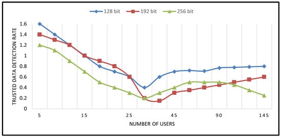 The identification of the feedback received by the users from the interface layer is also significant. If the received information is not trustworthy or the error rate increases, then it may affect the decision-making of the fog. The feedback is most critical as a few users can enter false information either purposefully or with the influence of their surroundings. In the proposed mechanism, the user feedback was compared to the data received by the monitoring layer to verify the information. For the identification of correct user feedback, the performance of the proposed mechanism was simulated with 5–145 users (which increased with time) and the encryption bits were 128 bit, 192 bit, and 256 bit. Figure 10 demonstrates the simulation outcome of the encrypted data. The result showed that the identification rate was higher at the beginning; however, with the passage of time, the 256 bit encrypted data performed relatively better at detecting false information.