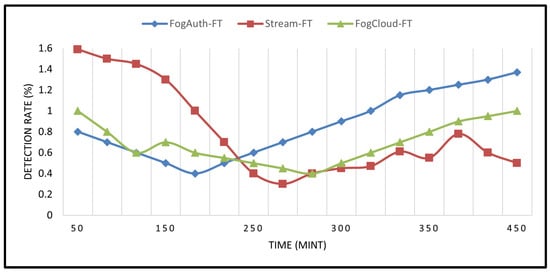 The robustness evaluation against the modification attack is the last parameter to validate the model efficiency. This is the most important and key factor of the system according to sensitivity and system resources. We applied modification attacks at different layers to validate the performance. The simulation environment consisted of 450 min, whereas the number of unauthentic nodes executing the modification attacks was 60 for the fist 250 min, which was increased to 150–450 min. Figure 12 illustrates the simulation outcome of the proposed mechanism. The result showed that the detection rate of the proposed mechanism was higher, whereas FogCloud-FT also performed better in comparison to Stream-FT.