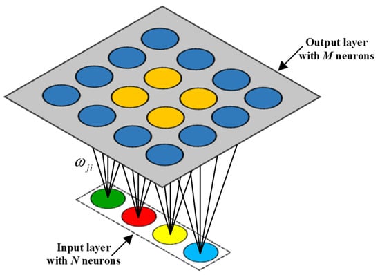 An SOM model is composed of two main layers of neurons as it is presented in Figure 1; the input layer is composed of N neurons, where each one represents an input variable of the input feature space; through the input layer, the received information is transmitted to the output layer. The output layer comprises predefined M neurons and, in this layer, aims to automatically adapt the input feature space in order to obtain a characteristic pattern map. Each neuron of the grid in the output layer represents a matching unit (MU). Normally, the neurons in the output layer are arranged in the form of a two-dimensional map, which is also known as the resulting SOM neuron grid. As Figure 1 shows, the connections between the two layers of the SOM network are always forward; that is, the information of the input feature space is propagated from the input layer to the output layer. Thus, each input neuron i is connected to each of the output neurons j by a weight ; in this way, the output neurons are associated with a vector of weights that is called the reference vector or codebook, since it constitutes the prototype or average vector of the category represented by the output neuron j. Thus, the SOM model defines a projection from a high-dimensional data space into a two-dimensional neuron grid map of neurons [,,].