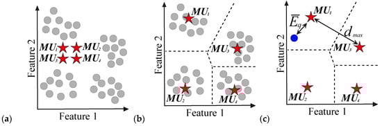 An additional advantage of using SOM to model an input feature space is that SOM performance is qualitatively measured in terms of the , that also provides information regarding the detection of unknown events that do not match with the topology of input feature space used to create a SOM neuron grid model. In Figure 2a–c, general and visual descriptions that depict the learning procedure performed to model a SOM neuron grid are shown.