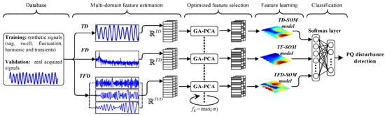 Thereby, the main contribution of this work relies in the proposal of a strategy for optimal feature selection that allows for modeling electric signals through statistical features in different domains that are used to better characterize the behavior of a PQD. The proposed methodology considers as a first step the implementation of a multi-domain feature extraction. Since the resultant number of features is high, a GA–PCA optimization is carried out to eliminate those features that provide redundant information. Then, a feature learning stage is implemented. In this step, self-organizing maps (SOM) are used to obtain a model of the PQD in the time, frequency and time-frequency domains. Finally, the SOM models obtained in every domain are used as inputs of a softmax layer ANN that works as the classifier. In the present work, both stationary and non-stationary disturbances are considered. Among the wide variety of PQD, only the following are considered: harmonics and voltage fluctuations for the stationary disturbances; and voltage sag, voltage swell, and transients (impulsive and oscillatory) for the non-stationary disturbances. These disturbances are selected because their appearance is common in grids that include renewable resources such as wind generation. The training and validation of the proposed strategy are performed using a set of synthetic signals that are modeled to be a reliable representation of electrical signals containing PQD. Then, the methodology is tested using two different groups of real signals. The first set is provided by the IEEE 1159.3 working group, whereas the second one corresponds to a series of measurements taken in a real wind farm located in northern Spain. As previously mentioned, the existence of PQD can produce a malfunction of the components of the machine; therefore, this methodology aims to be a tool for detecting PQD and improving the reliability of the wind turbine by preventing its failure. In this way, the designers and manufacturers of wind turbines can consider the existence of PQD during the entire production process in order to improve the quality, not only of the power supply, but of the entire generation system.