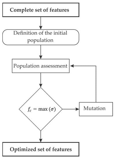 Considering the three proposed domains (TD, FD and TFD), a total of 74 statistical features are estimated. This is a considerable number of features, and there is no guarantee that all of them provide valuable information regarding the PQD behavior. This is why it is necessary to perform an optimization in the feature selection process. For this purpose, the fusion of two different techniques, GA and PCA, is proposed. GA is a heuristic search algorithm based in Darwin’s natural selection. This technique has been widely used for solving optimization problems because of its ability for minimizing estimation errors. GA requires an objective function that will be the one in charge of defining the goodness of fit (GOF) in the optimization task. In this work, the objective function for the GA is directly stated by the PCA, a mathematical procedure that allows performing a reduction in the dimensionality of a problem, preserving the variability of the data. To assess the variability that has been preserved by the PCA, the data variance is used, and it is precisely this value of the parameter that will be used for the GA to perform the optimization task. The complete optimized feature selection is carried out following the procedure proposed in [] and illustrated in Figure 4 as described below: