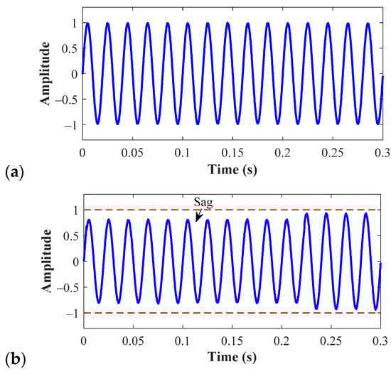 The term power quality is used for defining a wide variety of electromagnetic phenomena that occur at a certain time and location on the power system. These phenomena result in the parameters that describe an electrical signal, like frequency and amplitude, deviating from the ideal values, causing waveform distortions. According to the IEEE standard 1159–2019 [], voltage sag and voltage swell are RMS variations. The former occurs when RMS voltage decreases to a value between 0.1 pu and 0.9 pu; the latter is represented by an increment of the RMS voltage to values above 1.1 pu. The same standard defines a transient event as a disturbance that is undesirable but momentary in nature. These events are classified into two categories: impulsive and oscillatory. A sudden nonpower frequency change from the nominal condition that is unidirectional in polarity is known as impulsive transient; in contrast, when an electrical signal presents a sudden nonpower frequency change in the steady-state condition that includes both positive and negative polarity values, then it is said that an oscillatory transient has occurred. Additionally, voltage fluctuations are defined as systematic variations of the signal envelope causing the peak value of the voltage signal to oscillate between 0.95 pu and the 1.05 pu. Finally, harmonics are sinusoidal components that are integer multiples of the fundamental frequency (usually 50 Hz or 60 Hz). When harmonics are combined with the fundamental component, they produce a waveform distortion that is evaluated using a quantity called the total harmonic distortion (THD). The IEEE standard 519–2014 [] establishes that the THD level must remain under the 8% in grids that handle voltages lower than 1.0 kV. All the aforementioned disturbances can be mathematically modeled, and Table 1 shows the equations that describe them.