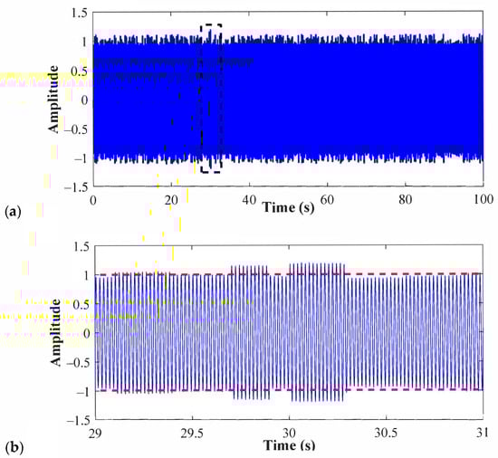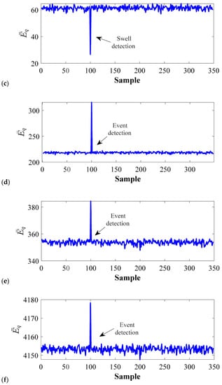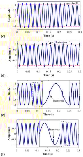 Hence, regarding the proposed method, a set of synthetic signals is generated as above described in order to produce different electrical signals that fulfill to the corresponding standard definitions; thereby, the generated synthetic signals belong to a normal condition or healthy condition, and five different disturbances such as sag, swell, fluctuation, harmonic and impulsive. In this regard, each synthetic signal was generated during 100 s by considering a sampling frequency of 8 kHz and 50 Hz as the fundamental frequency. In Figure 5a–f, are shown different electrical signals that are synthetically generated and that belong to evaluated conditions: healthy or normal, sag or swell voltages, transients, voltage fluctuations and harmonic distortion, respectively.