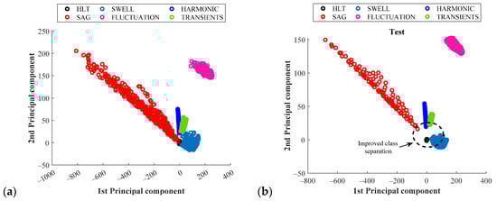 To validate the optimal feature selection procedure, the characteristic features matrices for all considered conditions in the FD are analyzed through the PCA technique. That is, the original 14 statistical features from FD are subjected to a linear transformation and are projected into a 2-d feature space to visualize the data distribution; thus, in Figure 6a, different clusters that represent all the considered conditions are projected. On the other hand, the PCA technique is also used to analyze the data distribution for all considered conditions by taking into account only the subset of selected features for the FD (features number 2, 3, 4, 5, 6, 10, 12, 14); thereby, in Figure 6b, different clusters are projected for all considered conditions and as it is appreciated an improved class separation is achieved by analyzing those selected features for the FD.