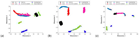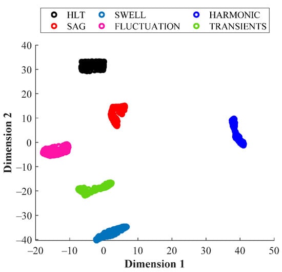 In order to interpret and to understand the results of the feature learning procedure, all the SOM neuron grid models are projected into a 2-d space by means of the T-SNE technique. In Figure 7a–c, are shown such 2-d representations that are carried out by considering all evaluated conditions but they are performed separately for each analyzed domain, TD, FD and TFD, respectively. As can be appreciated, most of the clusters that appear in Figure 7a,b are almost well-separated among them; notwithstanding, it is observed in Figure 7a that the sag, swell and fluctuations conditions appear very close to each other. This situation is more or less expected, since the behavior in the TD of these three disturbances is very similar: they present amplitude variations in the peak values of the voltage signal. Hence, if only the TD analysis is used, it is prone to failure in the identification of these types of disturbances. This situation is corrected when the FD is used and the sag, swell and healthy signals are now clearly separated (see Figure 7b). However, in the FD, the harmonic and transients conditions are overlapped. Again, this result can be explained by the fact that high harmonic contamination causes a severe waveform distortion and introduces unexpected peaks that may be considered as periodic transients. The worst cluster separation appears in the TFD (see Figure 7c), where a severe cluster overlapping is observed. In this case, the overlap among clusters can be associated with the use of the EMD, because this technique may suffer mode mixing and the behavior of a disturbance can be observed in more than one IMF. On the other hand, although the clusters of Figure 7c appear overlapped among them, the consideration of all SOM neuron grid models from TF, FD and TFD may lead to clear separation between all considered classes, remembering that each class represents a PQD. This statement is considered in this proposed approach, thereby, a 2-d visual representation is also performed by the T-SNE technique by analyzing the three domains of analysis, TD, FD and TFD, for all considered conditions; thus, in Figure 8 different clusters that appear clearly separated among them are shown. Then, even though some disturbances may have similar behaviors in one domain, they are different in other domains, and by using a multi-domain approach it is possible to differentiate every disturbance in a better way. It should be mentioned regarding Figure 8 that the contribution of different SOM neuron grids that are modeled through statistical features in different domains leads to a high-performance characterization of data that represents the evaluated conditions.