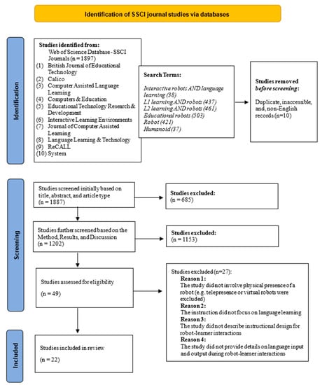 The authors employed a search strategy to retrieve articles published between 2010 and 2020 [30,31] in order to survey the development of RALL in the past decade. The databases included Web of Science, ERIC, and Ebsco, while journal sources included ten journals, most of which were from the Social Sciences Citation Index, in the field of educational technology and computer-assisted language instruction (e.g., Computers & Education, British Journal of Educational Technology, Computer-Assisted Language Learning, Educational Technology Research & Development, Interactive Learning Environments, System). The researchers conducted six searches using the following key terms—“Interactive robots AND language learning,” “L1 learning AND robots,” “L2 learning AND robots,” “Educational robots,” “Robot,” and “Humanoid,” which led to the retrieval of 1897 articles.