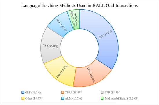 Language teaching methods in RALL oral interactions. NOTE: CLT = Communicative Language Teaching. TPRS = Teaching Proficiency through Reading and Storytelling. TPR = Total Physical Response. ALM = Audiolingual Method.