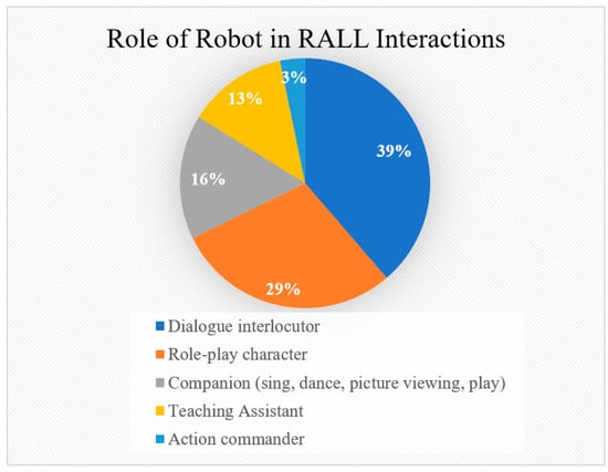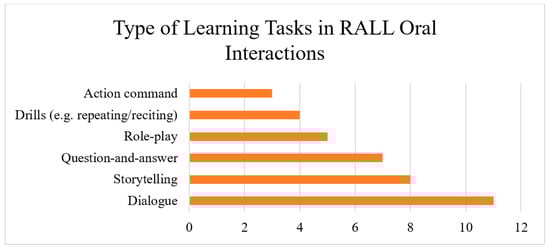 The interactive oral task design allowed the robot, human facilitators, and learners to engage in a well-orchestrated speaking practice in a contextualized and meaningful way. Some example actions performed by the interacting agents are summarized in Table 2. It is evident that RALL oral interactive mechanisms can be multifarious, each specific to the oral communicative goal and context. In most cases, the interactions were based on robotic functions such as (a) speaking [32], (b) making gestures and movements [39], (c) singing [34], (d) object detections [40,41], (e) voice recognition functions [42], and (f) display of digital content on the accompanying tablets [43]. While robots were used to facilitate bi-directional communication by initiating or engaging in verbal, gestural, and physical interactive processes to allow learners to practice receptive (e.g., listening and reading) and productive (e.g., speaking and writing) language use, human facilitators constantly provided procedural, learning, and technical support [34,38] to learners during the interactive tasks.