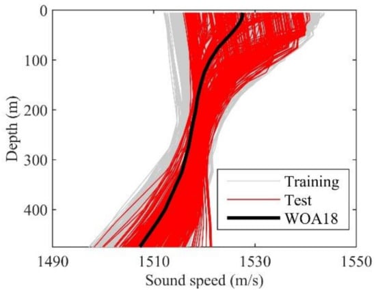 All in situ surface measurements and SSP samples used were from the KEO. As a surface mooring, the KEO (32.3° N, 144.6° E) has a long record of daily real-time measurements in the ocean. The slack-line mooring provides a rich variety of surface and subsurface data, including longwave radiation (LR), shortwave radiation (SR), wind speed (WS), surface temperature (ST), surface salinity (SS), air temperature (AT), surface density (SD), heat content (HC), relative humidity (RH), temperature profile, and salinity profile. The temperature and salinity profiles of the SSP samples can be calculated from Del Grosso’s empirical formula []. As EOF processing requires samples at the same depth, the SSP sample is considered completed only when its sample depths are shallower than 5 m and deeper than 475 m. And the remaining profiles were cubic interpolated to the nominal depths of sensors on the slack-line (5, 10, 15, 20, 25, 35, 40, 50, 75, 100, 125, 150, 175, 200, 225, 275, 325, 400, 425, 475). For the KEO, such a depth range can retain more perturbation description while losing too many samples due to the exclusion of shallower profiles. A total of 2277 profiles were finally obtained. Of them, 80% (1820 samples from 26 September 2009 to 3 October 2018) formed the training dataset, and the other 20% (457 samples from 4 October 2018 to 5 May 2020) were used as the test set.