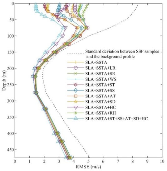 However, the SST and SL do not include details on the state of the ocean, and this reduces the accuracy of the SSP profile estimated by using them. Based on observations from the central Arabian Sea, Jain found that most errors in reconstructing the SSP occurred at depths of 40–125 m owing to insufficient information about the depth of the mixed layer provided by the SST and SL []. Similar errors occurred in SSP estimation in the South China Sea, where the SSP inferred from the SST and SL incurred large errors at a depth close to 500 m due to the exchange of water between the South China Sea and the Pacific Ocean in the Luzhou Strait. This could not be described by remote sensing parameters alone, so multisource parameters were added to strengthen the study of this area []. Huang conducted a visual analysis of the practicality of EOF in the South China Sea []. Considering that the information available for estimating the subsurface profile is limited, additional predictors are needed to offer richer information to improve the estimation of the SSP. Bao obtained the sea surface salinity (SSS) from both in situ and satellite observations to improve the results of the salinity profile reconstruction []. Ou and Chapman estimated SSP using a machine learning method based on SST and SL data []. Chen included inverted data from the echo sounder and the depth of the mixed layer in addition to the SST and SL to estimate the SSP []. The results indicated that multisource observations can significantly improve the results of estimation, and different predictors make varying contributions to the improvement in estimation.