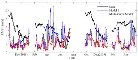 The estimation errors of all samples are shown in Figure 4. Except for a few samples, the multisource model improved the accuracy and robustness of the results. The standard deviation of the estimated SSP was 5.54 m/s and the maximum value was 9.73 m/s. Model 1 had an overall root mean square error (RMSE) of 3.49 with a maximum error of 11.10 m/s. Although the remote sensing parameters were effective predictors as inputs to the inversion model, insufficient information led to many incorrect results. The multisource model performed better than model 1 in about 80% of the samples. Its RMSE and the maximum error were 2.18 m/s and 6.66 m/s, respectively. In addition, about 82% of the estimated SSPs of the multisource model were within the error limit of 3 m/s, and this value decreased to only 58% without the in situ measurements.