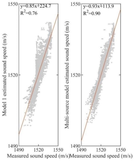 Figure 5 shows the estimated speeds of sound by two models at all depths. Model 1, based only on remote sensing parameters, had an overall mean absolute error of 2.52 m/s, with a value of the coefficient of determination (R2) of 0.76 and a slope of 37.2. The multisource model outperformed model 1, with an absolute error of 1.56 m/s, R2 of 0.90, and slope of 43.9. The speed of sound estimated by it had an error of only 0.1% compared with the measured speed of sound.