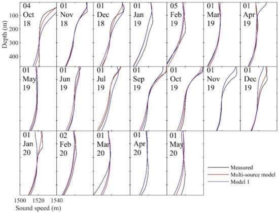 According to the variation in the estimation error with depth, it is clear that the accuracy of SSP reconstruction was related to the amplitude of perturbations. A large anomaly in the sound speed might have led to a larger error. Because the results were directly derived from the sea surface parameters, accuracy was relatively high near the sea surface even if there was a large deviation in the speed of sound. In the range of depth of 50–150 m below the surface, large errors occurred owing to seasonal and diurnal variations in the mixed layer. The differences between the models gradually decreased with increasing depth, and they delivered nearly the same performance below 250 m. The results of inversion show that the introduction of in situ measurement data improved the accuracy of SSP estimation. This was mainly reflected at depths close to the sea surface. In the case of a large perturbation deeper below the surface, the accuracy did not improve when only the sea surface parameters were considered. To examine the performance of the multisource method in practice, we assessed Model 11 further.