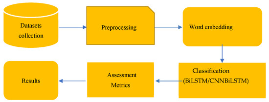The preprocessing step involves cleaning and removing noise from the dataset before the representation and transformation methods are applied. The goal of text processing is to transform and express online social post content in a way that can be analyzed and classified using the employed deep learning methods. However, the datasets need to be cleaned using the following steps: