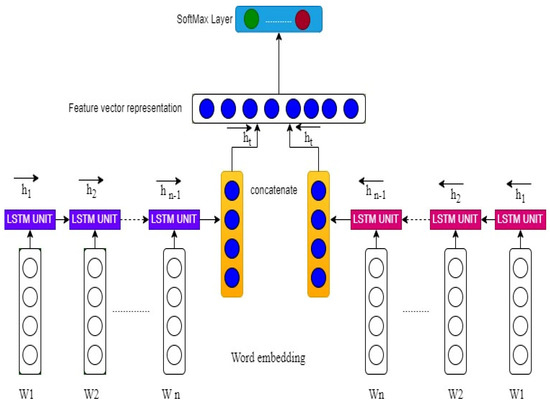 As illustrated in Figure 2, the BiLSTM model consists of three hidden neural layers to appropriately interpret the properties of the actual meaning of words, sequences, and phrases in the social media post. The first layer is an embedding layer that is the input layer designed with three components: maximum features, embedding dimension and input sequence length. Maximum features (vocabulary size) are the top 20,000 and 30,000 most frequent words selected from the training dataset of the binary and multiclass datasets respectively, as represented in Figure 3 by W1, W2…Wn. The embedding dimension determines the size of word embedding vector for each word in the selected vocabulary words that were encoded into sequences of integers. Custom embedding with specified 50 dimensions vector space was applied for word embeddings for the binary and multiclass datasets respectively. The input sequence length is defined as the average length of every input social media post in the datasets and set to 249 and 98 words. The main function of an embedding layer in the BiLSTM model is to make an input embedding matrix for each randomly chosen word from the training set, send it to the forward and backward LSTM (100 units) layers for analysis, and find the semantics of the input sequences of the social post contents so that an output SoftMax layer can classify them into different cyberbullying categories.