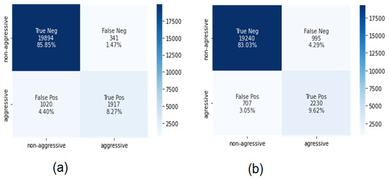 The proposed deep learning algorithms were applied to investigate the effectiveness of binary bullying classification. We categorized the binary class dataset into aggressive and non-aggressive bullying classes. The CNN-BiLSTM as well as single BiLSTM were considered as classification models for this dataset. Figure 5 depicts the confusion matrices for the binary classification dataset.