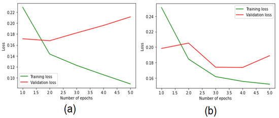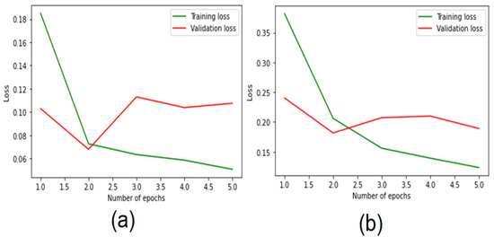 Accuracy loss of the (a) CNN-BiLSTM and (b) BiLSTM models using the binary dataset.