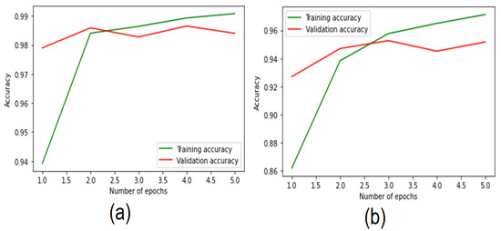 To analyze the results of both models, performance plots are used to visualize the training and validation accuracies in each epoch. As shown in Figure 11, the training accuracy of the BiLSTM started at 94% and reached 99%, while the model’s validation accuracy improved from 97.5% to 98.5%. The CNN-BiLSTM model has been increased from 86% to 96%.
