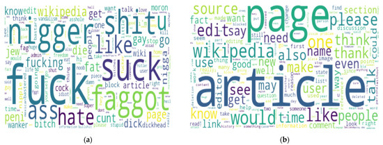 Word cloud for the binary class dataset (a) aggressive and (b) non-aggressive and cyberbullying.