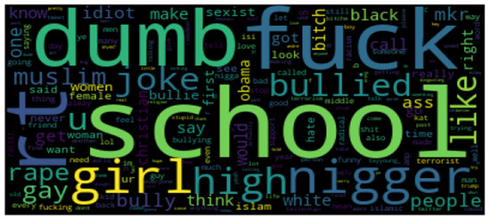 Word clouds are a technology that is employed in the natural language processing domain to visualize the most significant and frequently used words in a given text. Here, we have used word clouds to visualize the most repeated words in the binary and multiclass cyberbullying classification datasets. Figure 13 and Figure 14 show the word clouds of the two datasets.