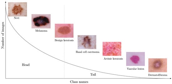 Illustration of the distribution of the ISIC 2018 public dataset [19,20]. The dataset exhibits a long-tailed distribution with a ratio between rare and majority classes greater that about fifty. Head corresponds to lesions in the dataset that are over-represented and Tail to lesions in the dataset that are under-represented.