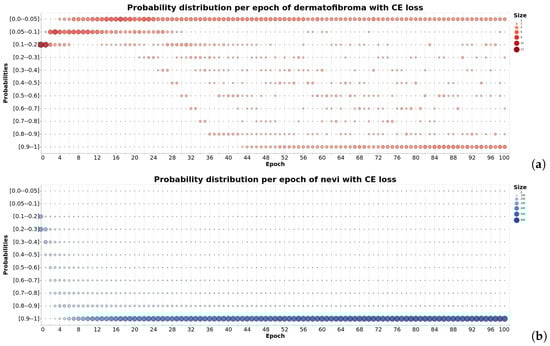 Distribution of prediction probabilities during training on the validation set for (a): tail class (dermatofibroma) and (b): head class (nevi).