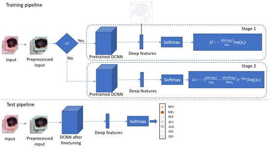 The overall steps of the proposed framework are shown in Figure 5. This framework is composed of two main phases: training and testing. In both phases, a preprocessing step is performed on the input images. The training phase is subdivided into two stages. In the first stage, a CNN is finetuned with the loss. This stage aims to guide the feature extraction of the CNN to learn a good representation of features for the given task. The second stage begin when the number of training epochs reaches a threshold T. In this stage, the CNN is finetuned with a weighted version of the loss. This stage aims to guide the learning of the classifier to balance the head and tail classes. It is advantageous to set T as the epoch when the model has begun to converge to the local minimum. In our study, T was automatically defined as the epoch for which the model performance on the validation split had not improved in terms of balanced accuracy for 10 epochs. The testing phase of the proposed framework performs the evaluations. The codes and models used in this paper are available in open source via the link provided in the supplementary material.