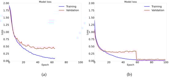 In order to have a better analysis of our approach, we plotted the learning curves on the training and validation datasets of the EfficientNetB3 model trained with the CS cost function (Figure 8a) and with our approach (Figure 8b). We can observe on Figure 8a that the model trained with the CS function reached its convergence around epoch 40, then its performance started to stagnate with no hope of improvement. On the other hand, for the model trained with our approach (see Figure 8b), we observe that the second training phase prolonged the convergence of the model. Indeed, when the model started to stagnate around epoch 40, the switch from the cost function to the cost function allowed us to obtain a significant performance gain, which could be observed through the difference obtained on the loss around epoch 60. As a reminder, we had defined a delay of 10 epochs before being able to automatically switch functions. This result highlighted the contribution of our approach compared to a classical learning procedure.