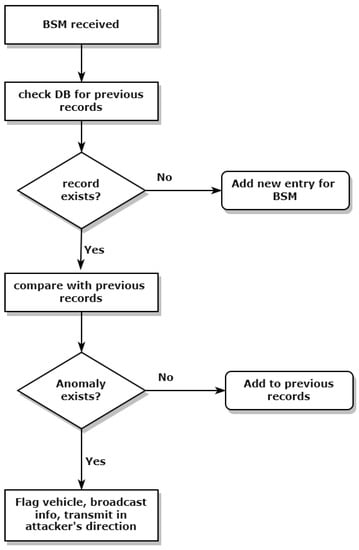 As the RSUs are aware of their surroundings and are capable of detecting anomalies in the network when a BSM is received at RSU from a vehicle, it firstly checks all the relevant data in the BSM and scans the centralized database for the previous BSM of the same vehicle. If the previous BSM of the same vehicle does not exist in the records, then the received BSM is documented for that specific vehicle. If the previous BSMs of the same vehicle are found in the records, then the RSU compares the current BSM with the previous BSMs to detect any anomaly that may be present in the concerned data, e.g., position falsification attack that may be initiated by a malicious attacker with an intent to cause harm. These position falsification attack data vary a lot from the legitimate data that are being generated by an authentic vehicle, as the specific fields in the BSM have quite extreme changing of values.Upon the detection of the position falsification attack, the next step is to alert the connected vehicles and prevent any harm that can be caused by such attacks. Algorithm 1 describes the anomaly detection that takes place at an RSU.