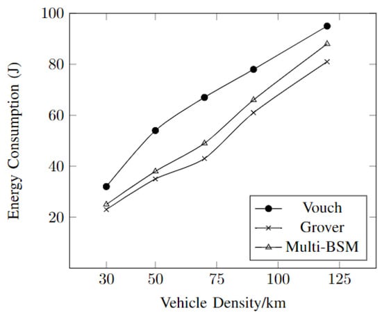Figure 5 shows the correlation between energy consumption and vehicle density in the increasing order at the RSU. It can be seen that the vouch algorithm consumes the most energy as the density of the vehicles is increased. The multi-BSM and Grover algorithms are somewhat similar in consumption of the energy, with the multi-BSM being a bit higher.