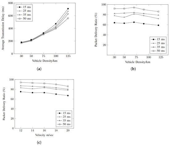 Figure 6a shows the relationship between the increasing vehicle density with average transmission delay regarding the different intervals. It can be seen that the average transmission delay is kept at the lowest with the increase in the vehicle density when the generation interval is kept at 50 ms.