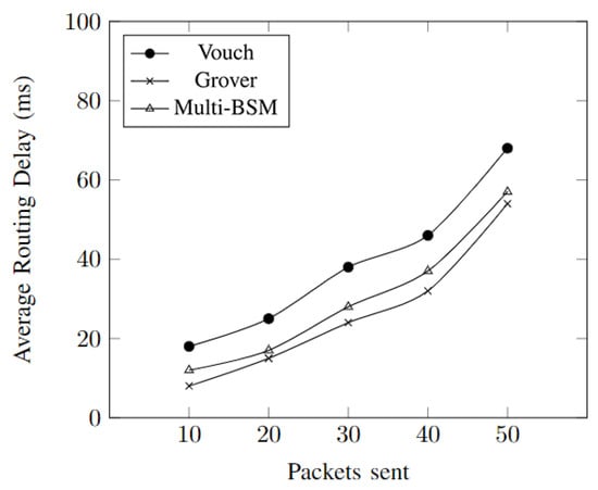 Figure 7 shows the average routing delay alongside the number of packets that are being sent through the network. It is being observed that the most routing delay is incurred in the vouch algorithm, with the Grover and multi-BSM close to each other.