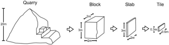 Marble is a metamorphic, i.e., heated and compressed, rock originating from sedimentary limestone. Marble is quarried naturally and contains mainly calcium. In some cases, magnesium can prevail, and then the rock is called dolomite []. Marble is quarried in blocks of 3 × 2 × 5 m. From these blocks, slabs are cut, usually in the size of 3 × 2 m with thickness ranging from 2 to 4 cm. Slabs are further cut into tiles of various sizes, depending on the needs of the construction. The schematic procedure of marble from the quarry into tile is illustrated in Figure 1. Photos of marble in all processing stages are provided in Figure 2.