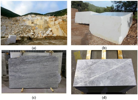 (a) A quarry at Paggaion Mountain, Kavala, Greece; (b) two blocks of white marble originating from Thassos Island, Greece; (c) a marble slab; (d) a tile of Grey Lais dolomitic marble from Falakron Mountain, Drama, Greece.