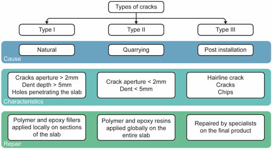 Traditionally, white marble with no watermark texture and flaws such as cracks, inclusions, or cavities was used as an ornamental stone and was rated as a high-quality stone []. Although that type of marble is still highly valued in the market, progress in using chemical products has allowed the marble industry to repair even highly defected marble slabs. Flaws in marble slabs can be grouped into three main categories, as illustrated in Figure 3. Type I includes bigger cracks and holes as a result of natural processes during the exhumation of the rock mass due to brittle tectonics. These flaws are created before the quarrying of the marble blocks. Type II flaws are smaller cracks as a result of the handling of the material during the quarrying of the marble in the factory. These are treated usually by the resination of the entire slab. Type III defects are caused during and after installation and are not treated in an industrial environment. In this work, the aim is to develop an algorithm to detect cracks of Type I and Type II.