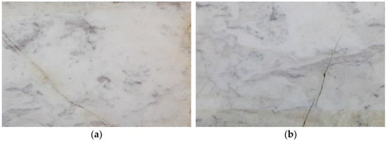 (a) Textured marble without cracks. The line resembling a crack at the left–bottom section of the image is a fissure; (b) textured marble with cracks. Two parallel cracks at the right–bottom section of the image. Both depicted marble samples have not been treated with any resin.