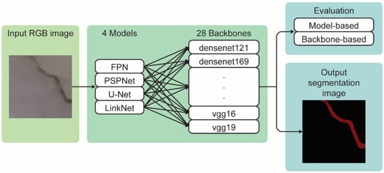 The proposed methodology derives from the combination of 4 semantic segmentation models with 28 feature extraction networks. The aim of this modular design is to investigate the combination that best fits the crack segmentation problem. In addition, the most appropriate Loss function for the problem under study is also investigated. Experimental results are evaluated based on two different perspectives: (1) based on the model and (2) based on the backbone. Figure 6 illustrates the proposed methodology.